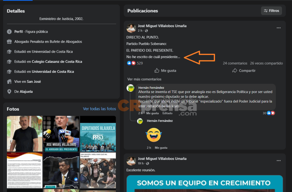 Posteriormente, Villalobos publicó en su perfil de Facebook que “nunca ha escrito de cuál presidente”, refiriéndose al partido Pueblo Soberano.