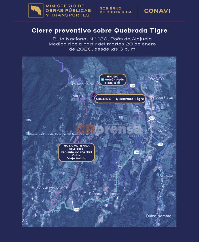 El Consejo Nacional de Vialidad (Conavi) informa que, como medida preventiva ante el riesgo de colapso del puente sobre la quebrada Tigre, ubicado en la Ruta Nacional N.° 120, se establecerá un cierre total del paso vehicular a partir del martes 20 de enero de 2026, desde las 6:00 p. m.
