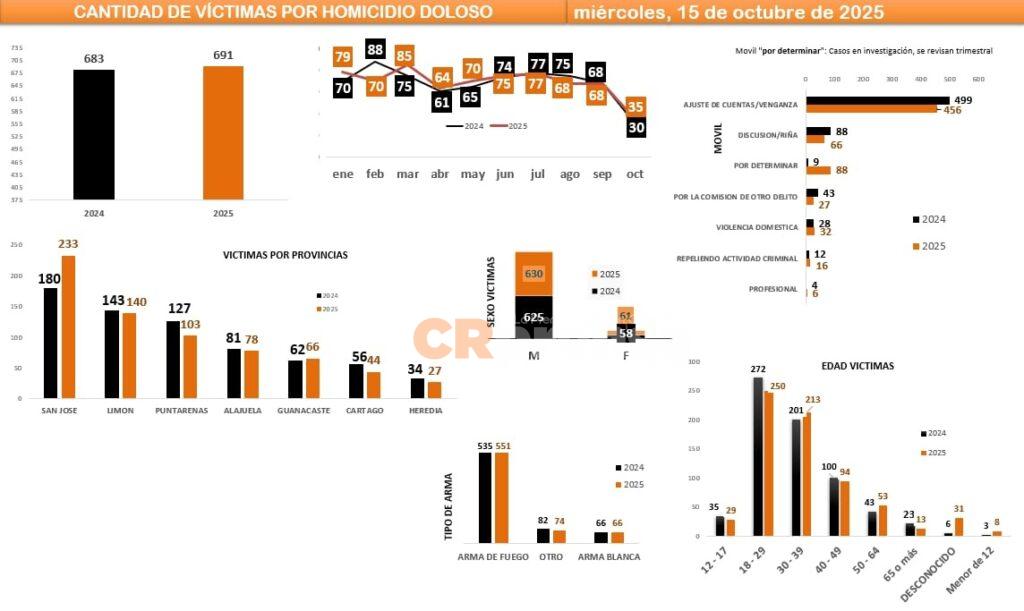 El Organismo de Investigación Judicial (OIJ) informó que hasta el 15 de octubre de 2025 se registran 691 víctimas de homicidio doloso en Costa Rica, superando los 683 casos contabilizados en el mismo periodo del año anterior. El incremento confirma la persistencia de la violencia letal en el país, impulsada en su mayoría por disputas vinculadas al crimen organizado.