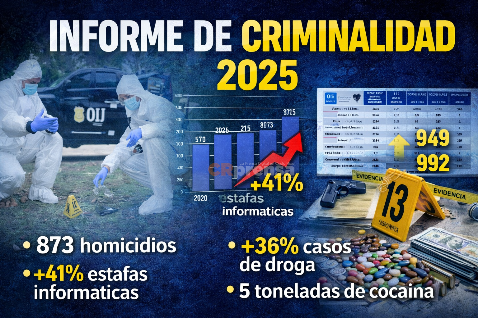 El Organismo de Investigación Judicial (OIJ) presentó su informe correspondiente al año 2025, en el que se confirma que Costa Rica mantiene indicadores elevados de criminalidad violenta, aunque se registró una leve reducción en la cantidad de homicidios dolosos en comparación con el año anterior. En paralelo, el país enfrenta un crecimiento acelerado en delitos informáticos y estafas digitales, consolidándose como una de las principales amenazas delictivas.
