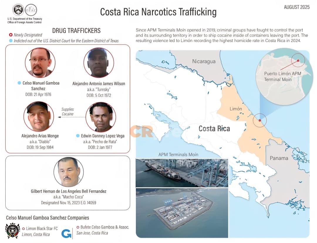 La Administración para el Control de Drogas (DEA) de Estados Unidos (EE.UU.) actualizó la lista de personas de la OFAC e incluyó a los costarricenses Alejandro Arias Monge alias “Diablo”, Celso Manuel Gamboa Sánchez, Alejandro Antonio James Wilson alias “Turesky”, y Edwin Danney López Vega alias “Pecho de rata”.