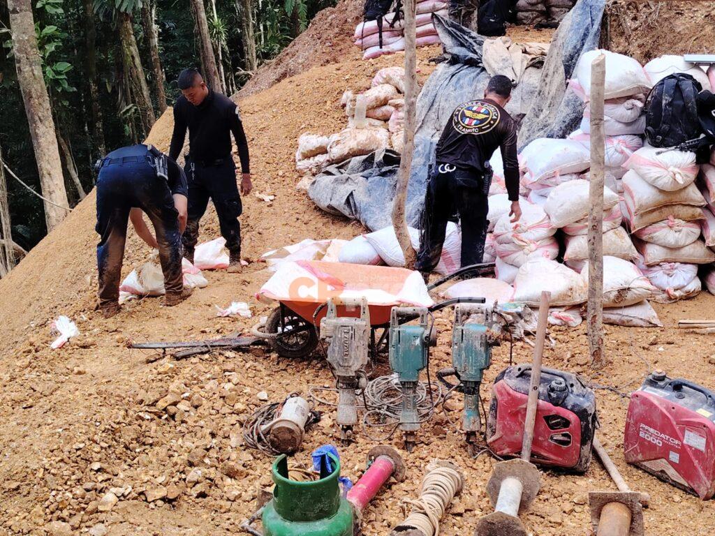 Los oficiales de la Fuerza Pública hallaron un gran cantidad de herramientas, entre las que se encuentran 53 palas, 3 plantas eléctricas, 4 rotamartillos, 1 bomba de agua sumergible, 13 barras de hierro y 17 sachos.