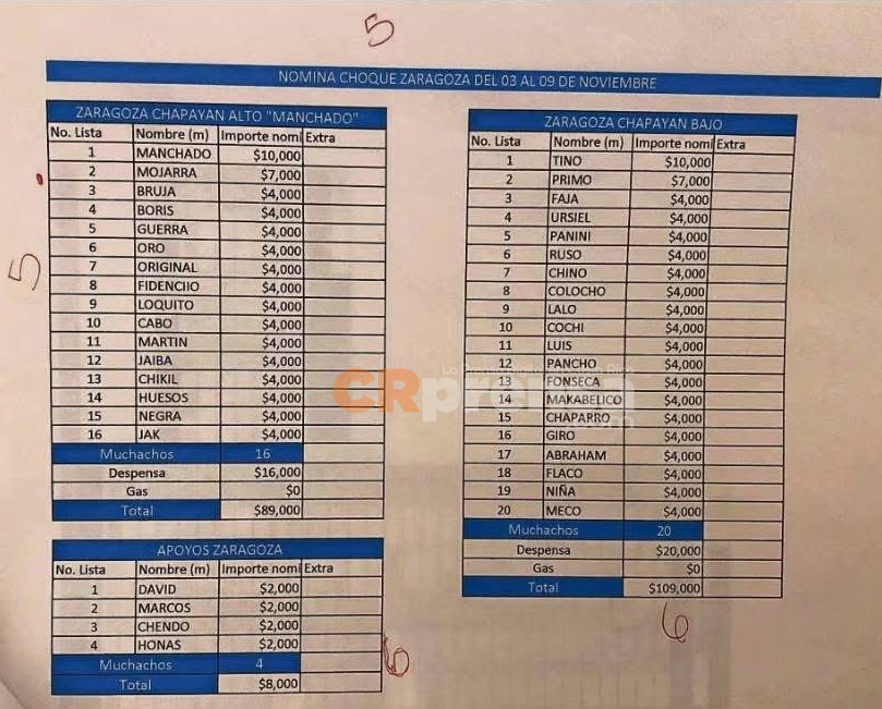Las listas, algunas manuscritas y otras en formato digital, detallan lo que medios han calificado como una “narconómina”: registros de ingresos, egresos, sueldos, sobornos y gastos operativos ligados a la estructura criminal del cartel. Incluyen pagos a sicarios, halcones, operadores y presuntos sobornos a policías y otros servidores públicos.
