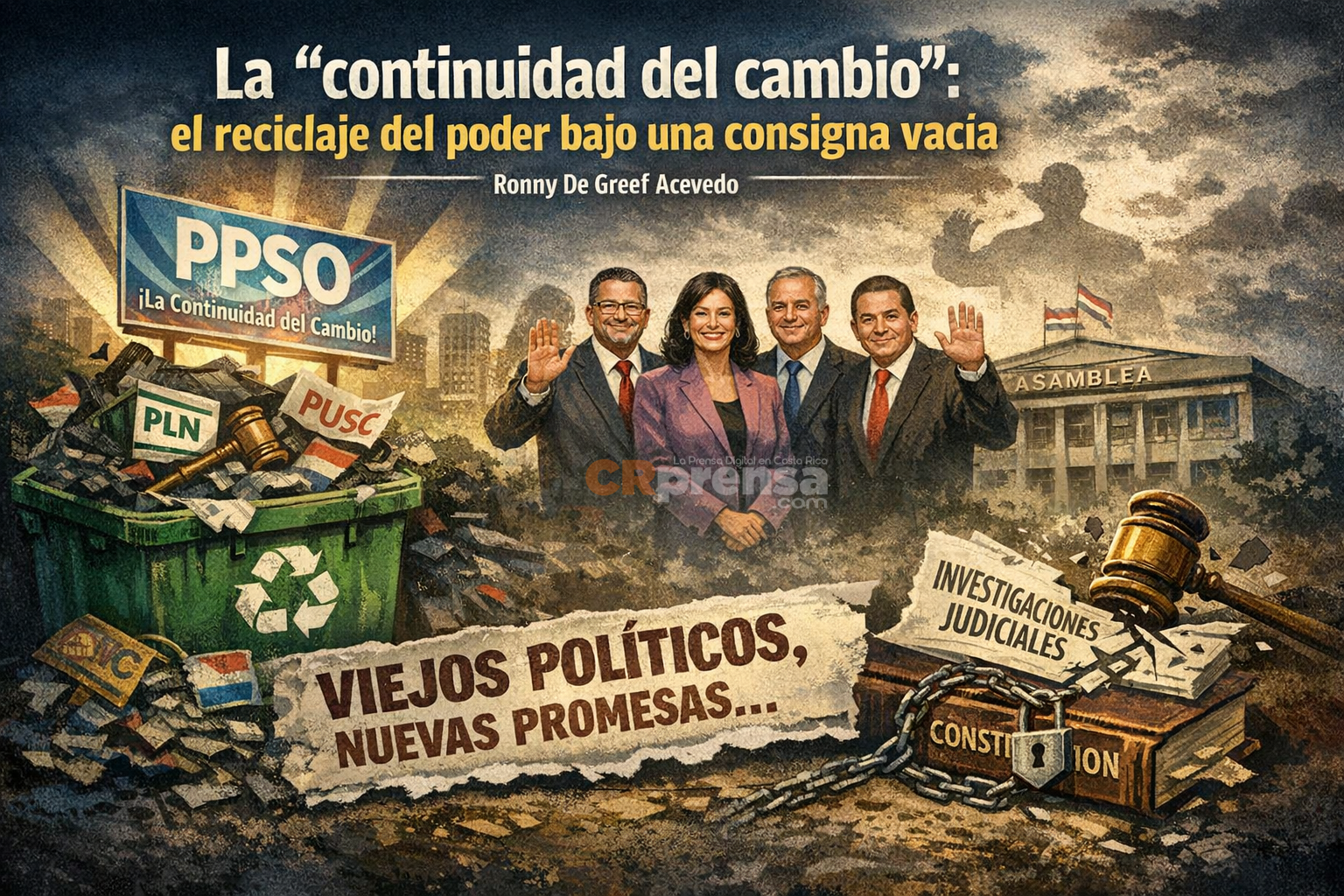 Opinión de Ronny De Greef Acevedo. El Partido Pueblo Soberano (PPSO), heredero directo del oficialismo del PPSD, se presenta ante el electorado como “la continuidad del cambio”. La consigna no es inocente: pretende instalar la idea de que el país se encuentra ante una fuerza política distinta, moralmente superior y desligada de los vicios históricos asociados al PLN, el PUSC o el PAC. Según este relato, el PPSO no solo carece de pasado, sino que además estaría legitimado para aspirar a una mayoría parlamentaria calificada de 40 votos, suficiente para reformar leyes fundamentales e incluso la Constitución. El problema es que la realidad desmiente esa narrativa punto por punto.