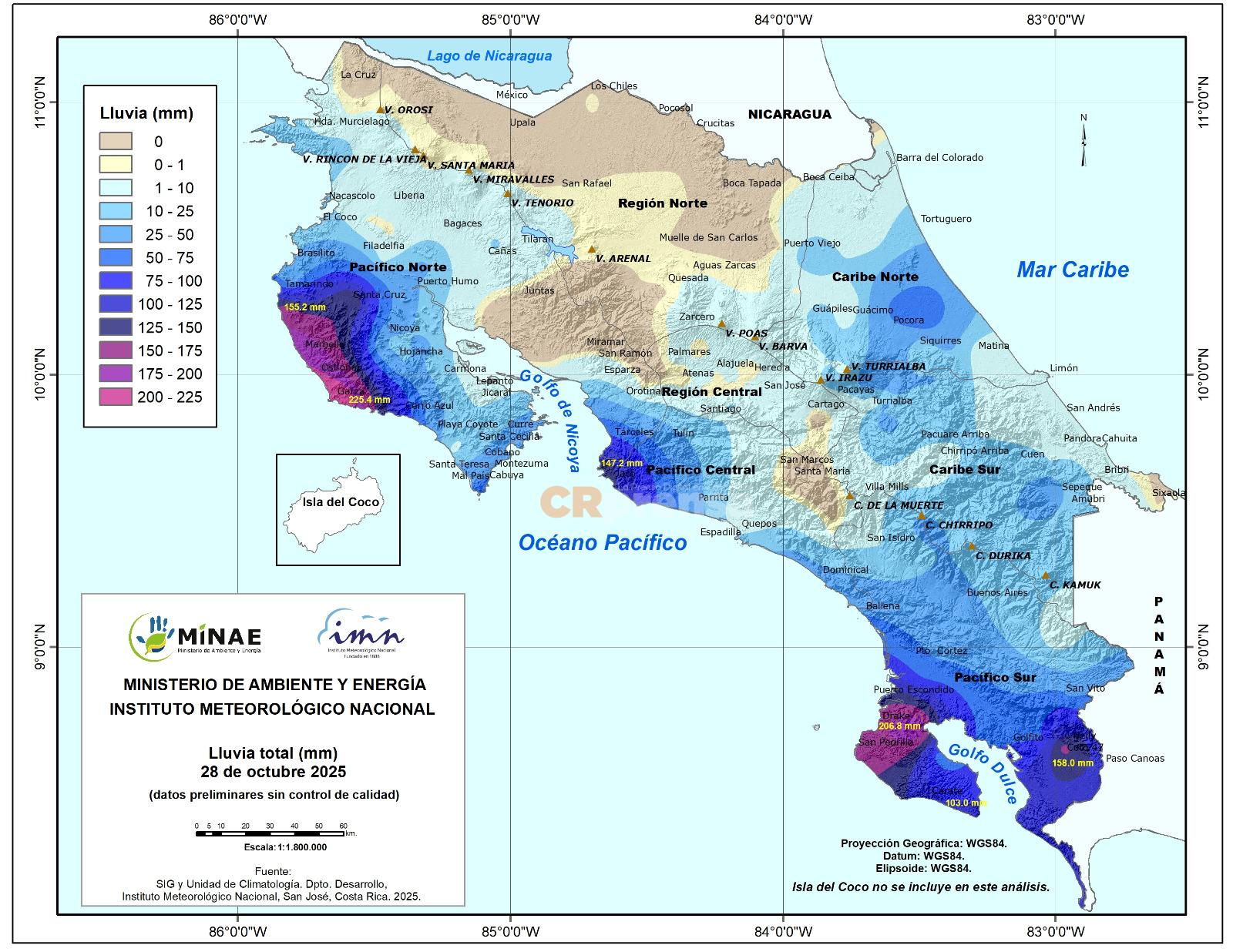 Diagnóstico: La influencia indirecta del huracán Melissa mantiene la Zona de Convergencia Intertropical sobre Costa Rica, aportando constante humedad al territorio nacional y generando lluvias en gran parte del país. Las precipitaciones más intensas se registraron en las montañas del Caribe (acumulados entre 25 mm y 55 mm), mientras que en el resto del territorio no superaron los 30 mm.