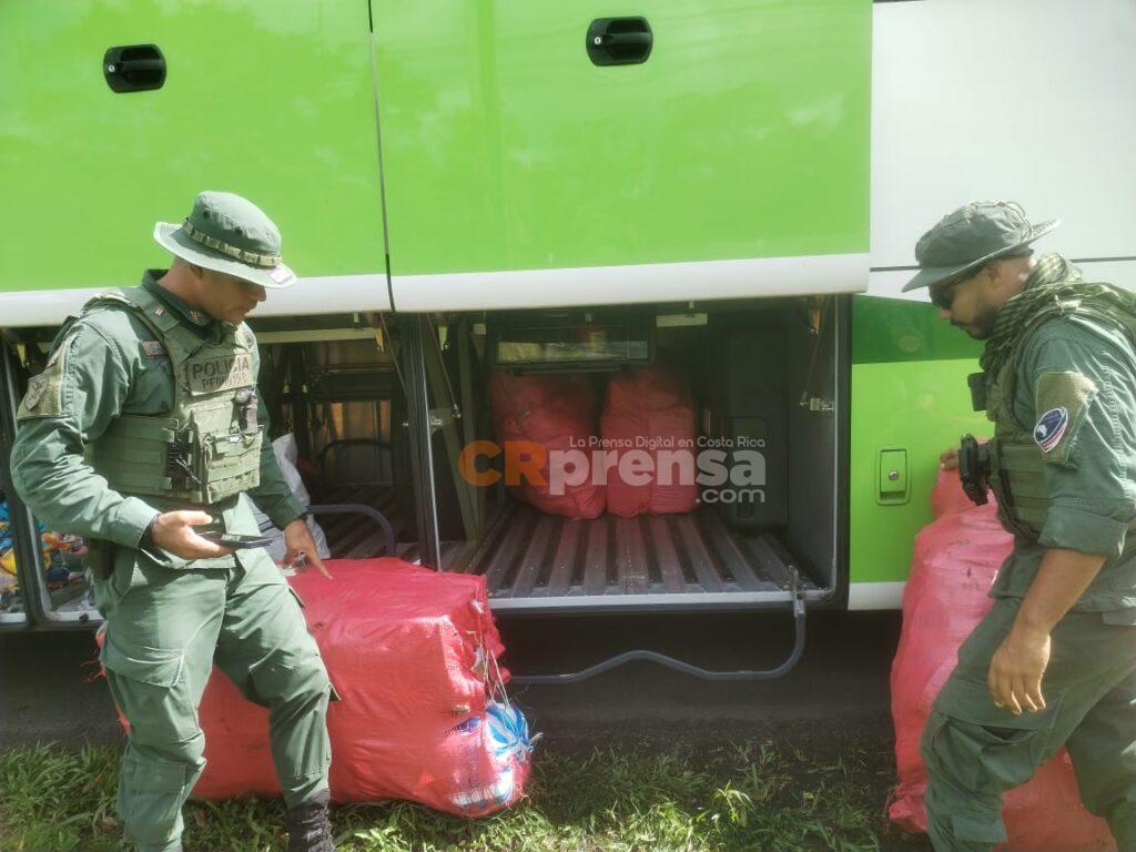 En otra acción policial efectuada en el Rosario de Upala, los oficiales de fronteras intervinieron un autobús que llevaba en sus maleteros varios sacos color rojo, los policías identificaron al dueño, quien les indicó que transportaba mercadería variada y que los trajo desde Nicaragua, sin las respectivas facturas de compra.