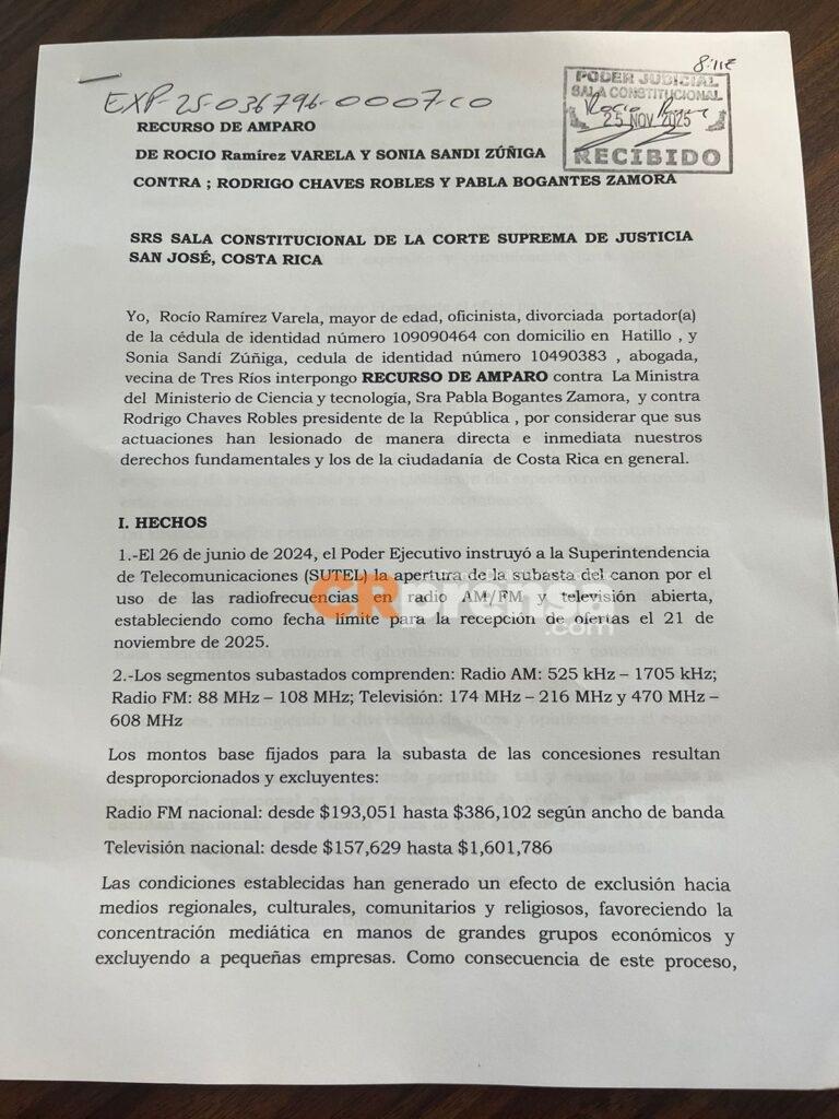 El recurso expone que el 26 de junio de 2024, el Poder Ejecutivo instruyó a la Superintendencia de Telecomunicaciones (SUTEL) a proceder con la apertura de una subasta del espectro radioeléctrico para emisoras de radio AM/FM y televisión abierta, fijando el 21 de noviembre de 2025 como fecha límite para recibir ofertas.