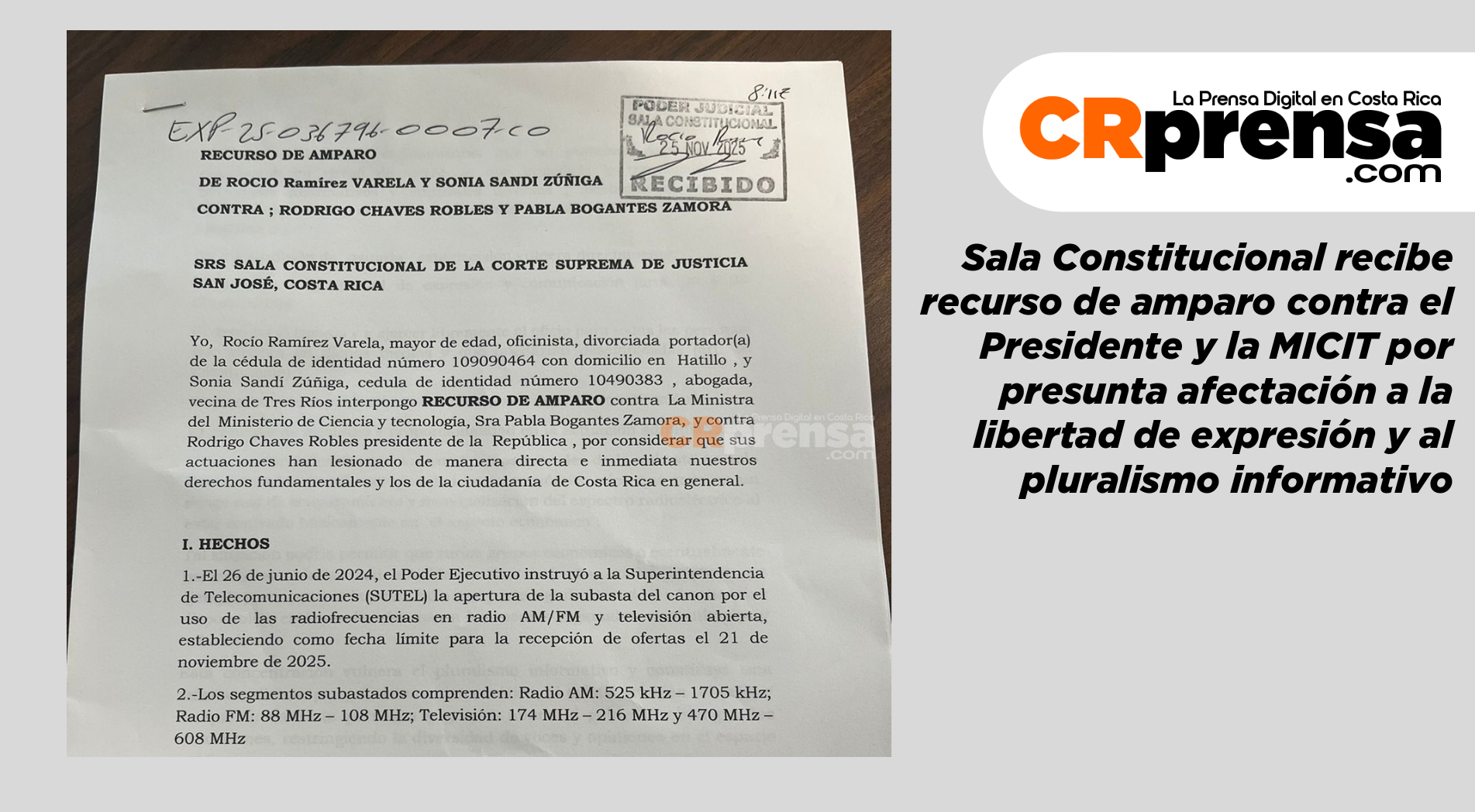 La Sala Constitucional de la Corte Suprema de Justicia recibió un recurso de amparo interpuesto contra el presidente de la República, Rodrigo Chaves Robles, y la ministra de Ciencia, Innovación, Tecnología y Telecomunicaciones, Pabla Bogantes Zamora, por presunta vulneración directa e inmediata a derechos fundamentales asociados a la libertad de expresión, el acceso a la información y la pluralidad de medios de comunicación en el país.
