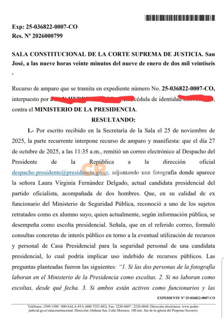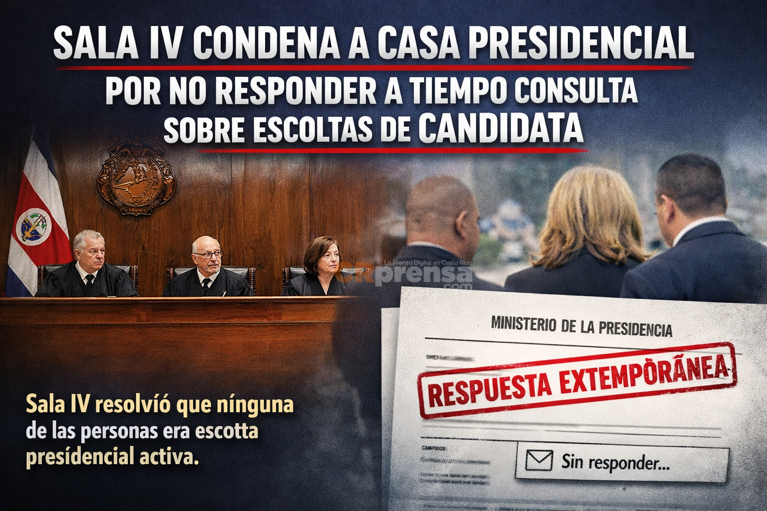 La Sala Constitucional declaró con lugar un recurso de amparo contra el Ministerio de la Presidencia, se trata de la resolución N° 2026000799 sobre el expediente 25-036822-0007-CO, al concluir que la institución violó el derecho constitucional de petición y pronta respuesta al no atender dentro del plazo legal una solicitud de información de interés público relacionada con la presunta utilización de escoltas en el entorno de una candidata presidencial.