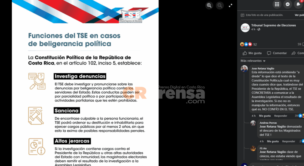 Recientemente, el Tribunal Supremo de Elecciones (TSE) publicó en su perfil de Facebook el texto del Artículo 102, inciso 5 de la Constitución Política de Costa Rica. Sin embargo, la información compartida es parcial y no refleja el contenido completo que establece la Constitución.